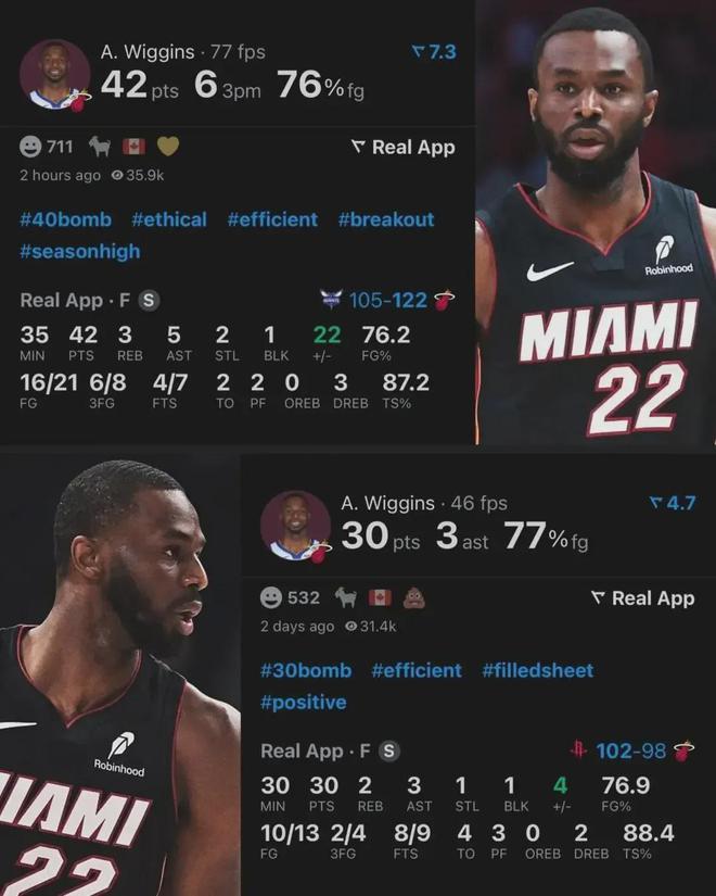于是维金斯被迫离开了效力多年的勇士,把天赋带到迈阿密,常规赛为热火出战17场全部首发,场均上阵32.1分钟,砍下19分4.2板3.3助1.2断,三项命中率45.8%、36%和73.1%,包括单场以76.2%投篮命中率(投篮21中16)狂轰42分。