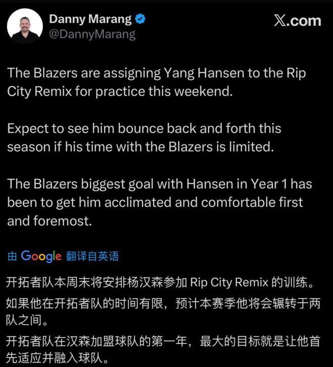 在今日早些时候,开拓者队即在播客节目谈到杨瀚森表示:杨上一场没有打生涯,首次被也被下放到G联盟撕裂之城混音队找状态,我认为他不会在G联赛打比赛,如果受伤了或者发生其他什么情况,他们都不希望发生在季联赛,他们不希望在那里发生那种情况,而且他们也认为未必需要通过与低级别对手对抗来积累经验,也许让他在季联赛打球获得一些信心,这些是更有价值的,但那里缺乏真正的大个子对抗,而他需要适应级别NBA级别的中锋,所以总结来看,似乎开拓者队记的意思是杨翰森不能受伤,需要出现在场边。