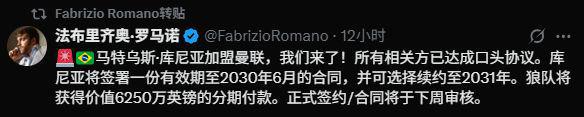 北京时间5月26日,著名记者罗马诺Here we go确认狼队前锋库尼亚即将加盟曼联,相关方全部达成口头协议。