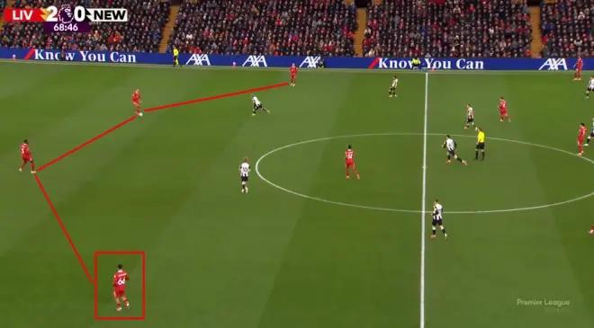 在安菲尔德球场的告别赛中,这位英格兰球员进入中场的次数减少了。此前,他更多地出现在内侧位置,要么在利物浦从后场组织进攻时占据中场中路的位置,要么像下面这张图片展示的那样,在比赛的最后三分之一时间控球时也是如此……